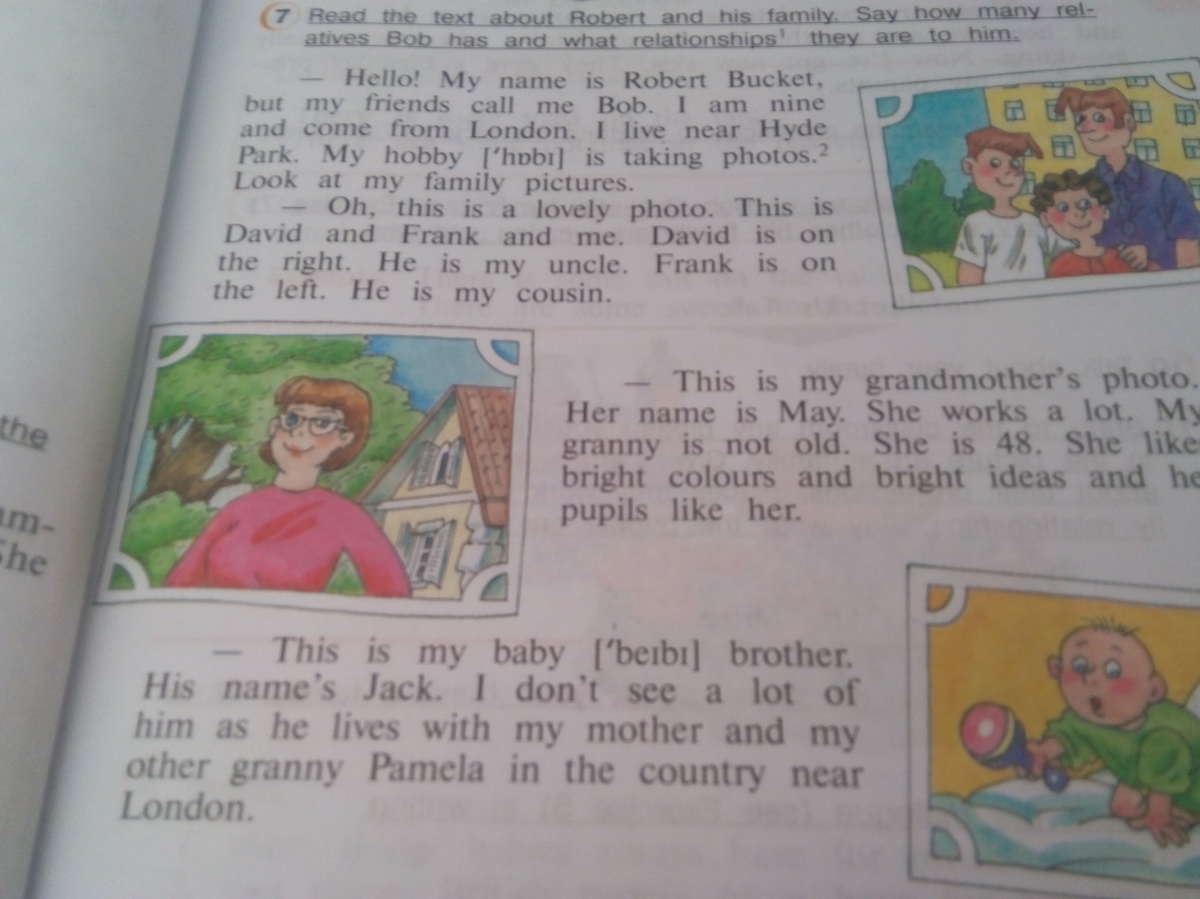 Привет . Меня зовут Роберт Бакет , но друзья зовут меня Боб . Мне 9 лет и я из Лондона . Я живу около Гайдейского парка . Мое хобби фотографировать . посмотрите на картинки моей семьи .