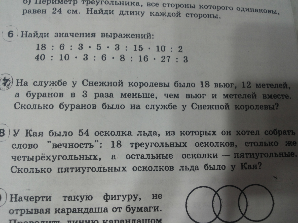 1.) 18+12=30-вьюг и метелей вместе 2.) 30÷3=10--буранов ответ:у Снежной Королевы на службе было 10 буранов.