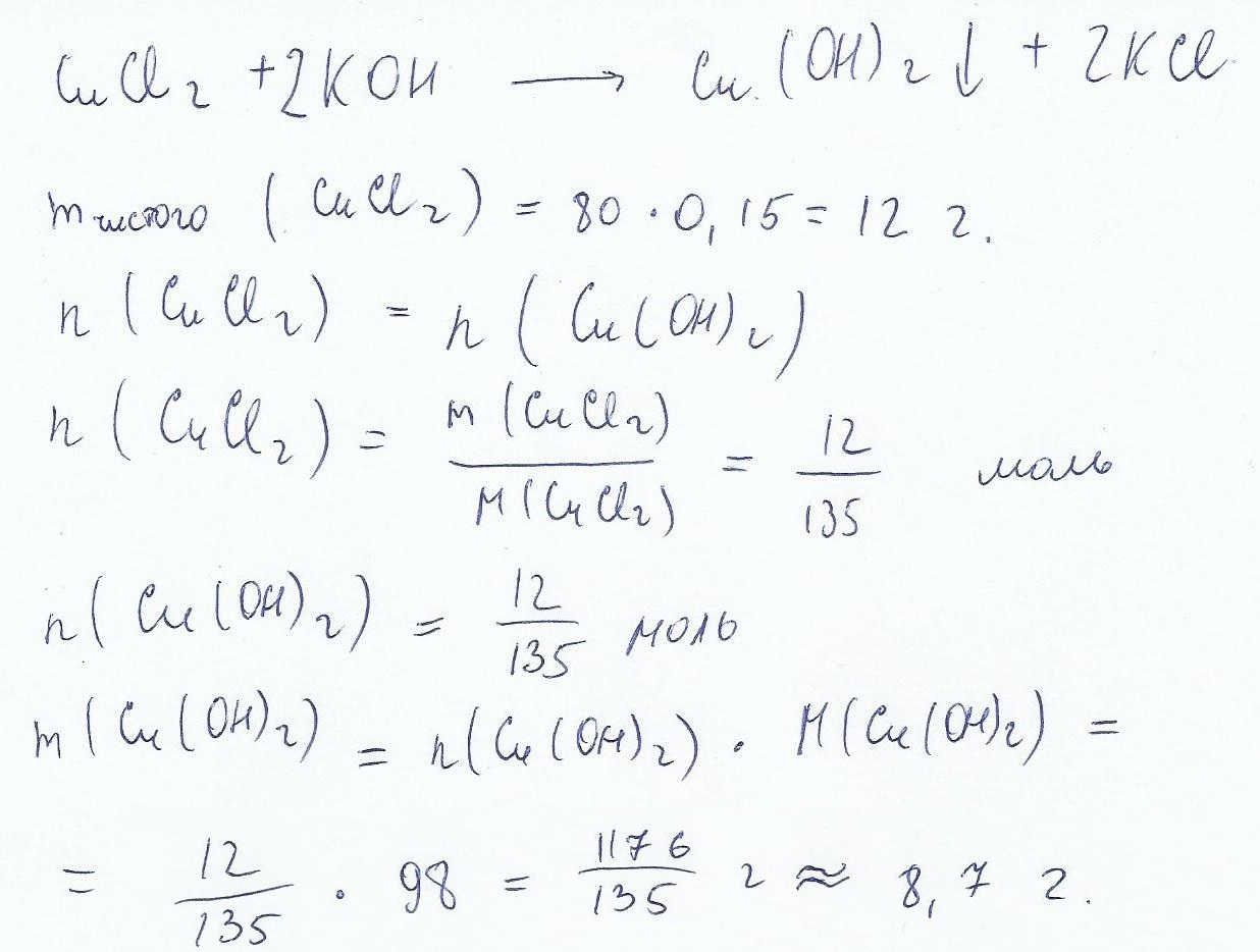 Помогите пожалуйста решить задачу.К 80 г 15%-ного раствора хлорида меди(2) прилили избыток раствора гидроксида калия. Рассчитайте массу образовавшегося осадка.