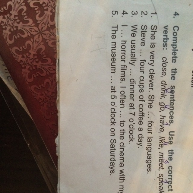 1 speaks 2 drinks 3 have 4 like-go 5 closes
