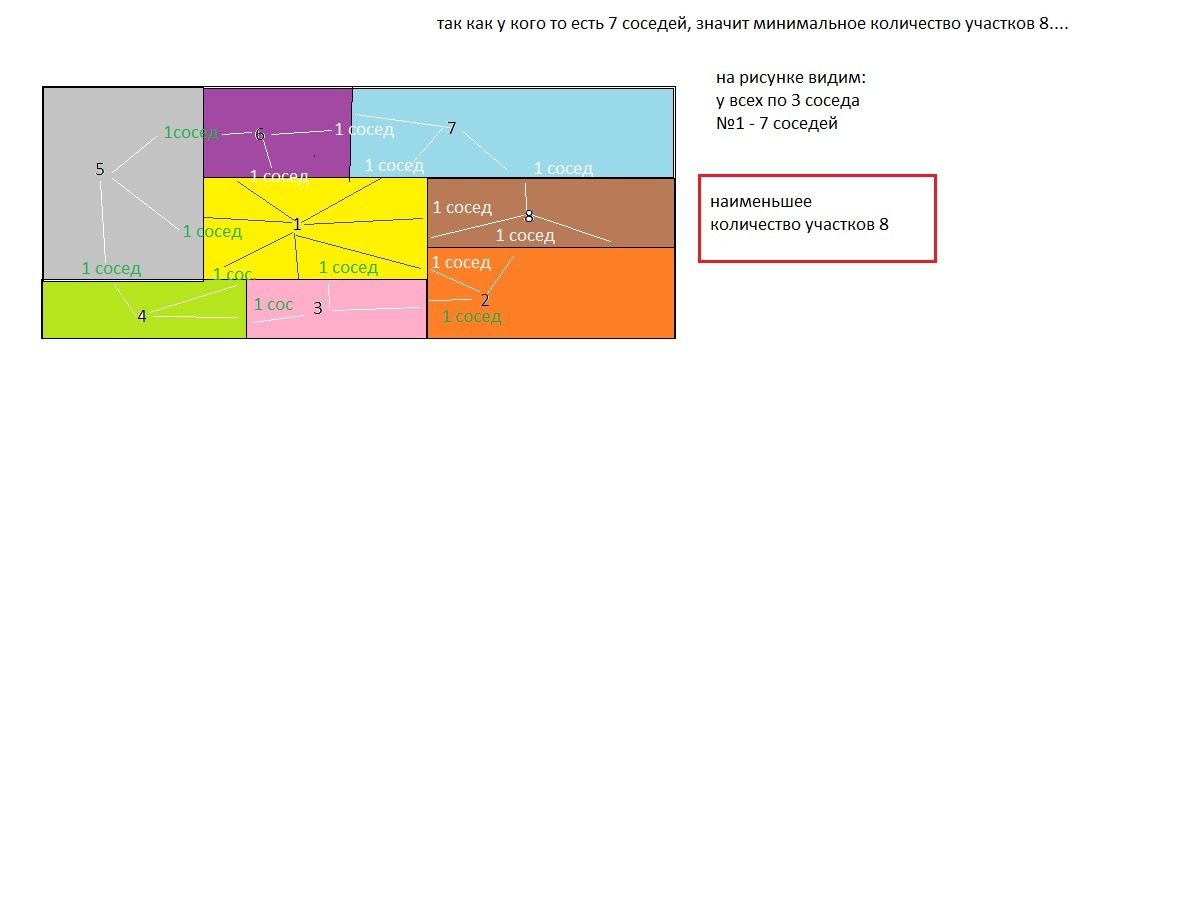 У короля есть прямоугольный остров, разбитый на несколько прямоугольных участков, принадлежащих феодалам. В ответ на заданный каждому вопрос «сколько у Вас соседей?» было дано ровно два вида ответов: «три» и «семь» (участки соседние, если у них есть общий отрезок границы). При каком наименьшем количестве участков такое возможно? Не забудьте обосновать свой ответ.