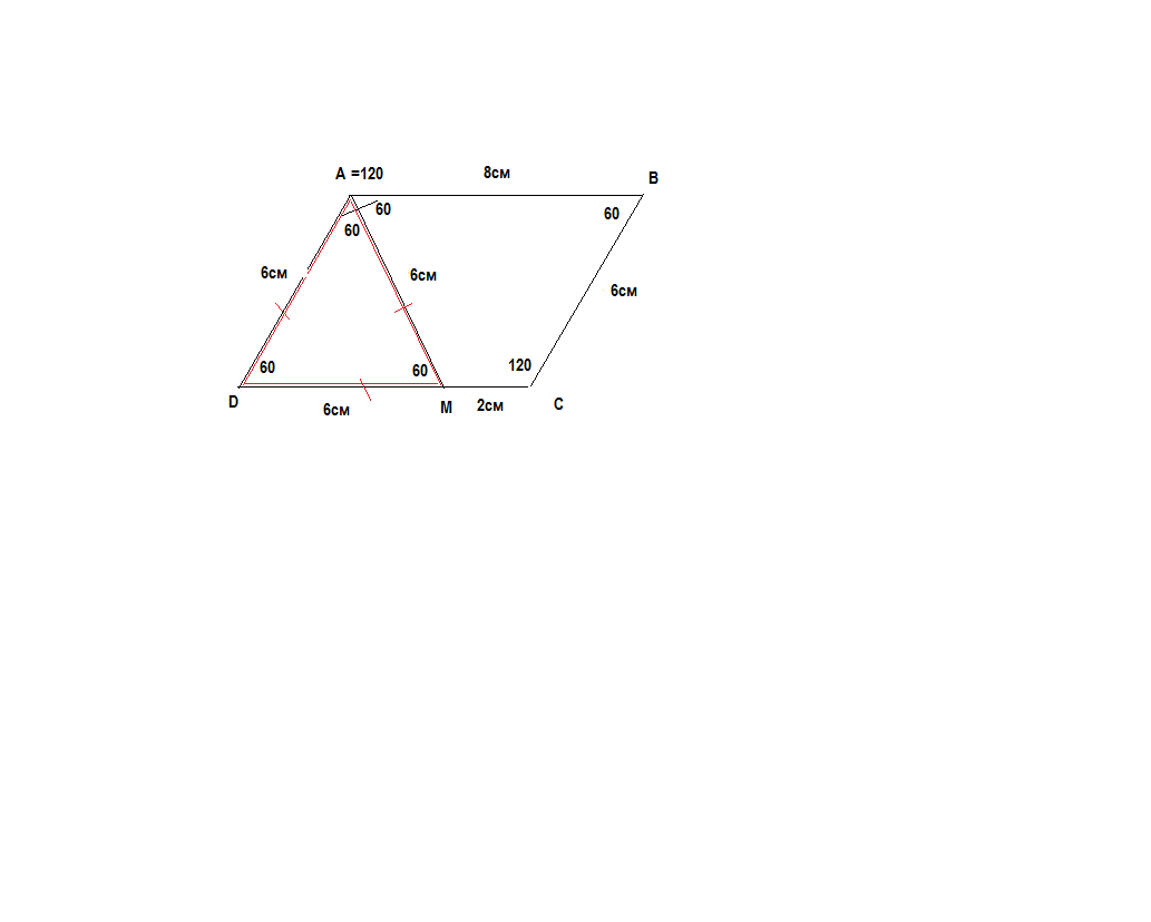 угол А равен 120 градусов и бессектриса этого угла делит сторону DC на отрезки DM=6см и MC=2см