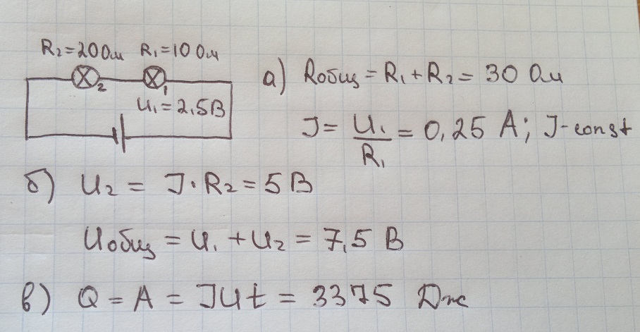 Одна лампочка сопротивлением 10 Ом и другая сопротивлением 20 Ом включены последовательно. Напряжение на первой лампочке 2,5 В.
