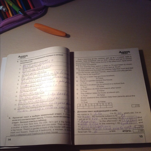 перевод ответов дословно:A. Уоррен сестра получила тебя, брат. B. Есть сад за домом. C. Уоррен братья ходят школу на школьном автобусе. D. Дети делают уроки после обеда. E. Дети слушают музыку в