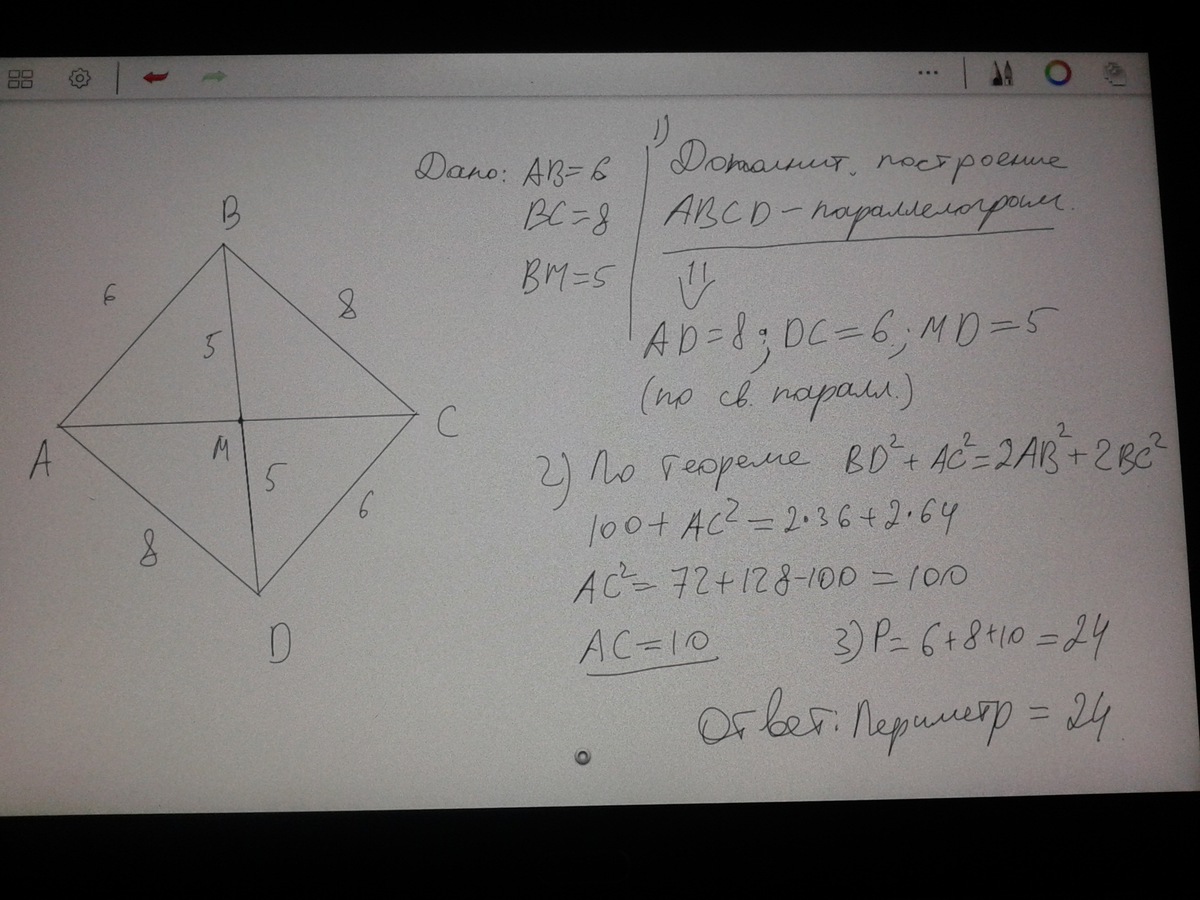 Найдите периметр треугольника,две стороны которого равны 6 и 8,а медиана,заключенная между ними,равна 5.
