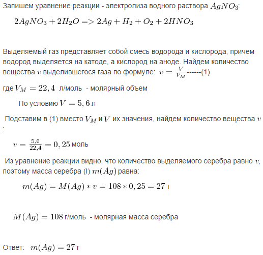 При электролизе водного раствора AgNO3 выделилось 5,6 литров газа сколько грамм металла отложилось на катоде.