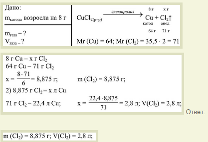 2 задача: При электролизе раствора CuCl2 масса катода увеличивается на 8 грамм. Какой газ выделится, какова его масса?