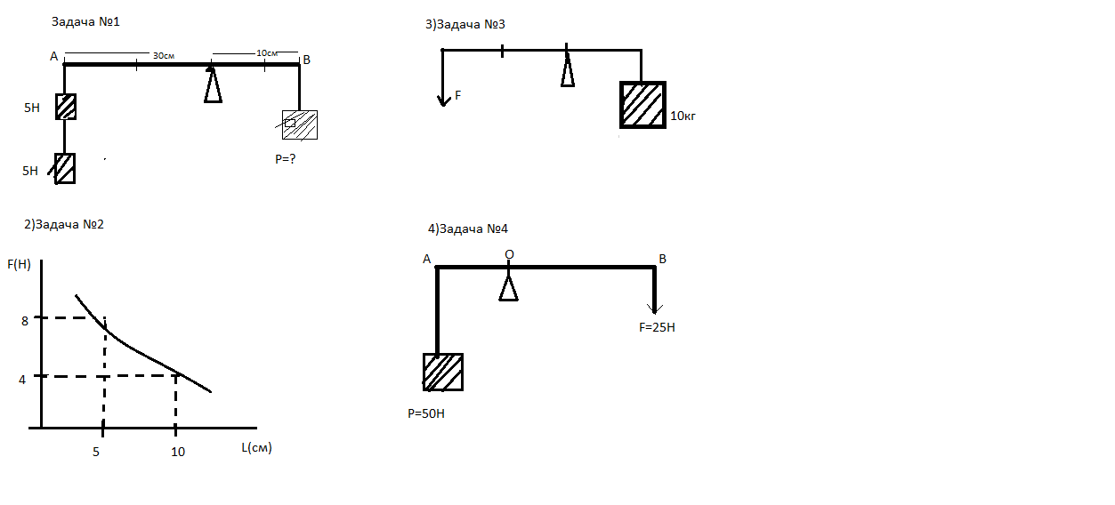 1)Задача №1 В точку А рычага,подвешено 2 тела по 5Н,чтобы рычаг был в состоянии рвновесия какова величина Р=?(рисунок первый во вложении) 2)Задача №2 На рисунке дан график зависимости силы от плеча при постоянном силы момента.Найти силу момента(рисунок 2 во вложении) 3)Задача №3 Чтобы рычаг находился в состоянии равновесия,какова должна быть мдуль силы F?(рисунок 3 во вложении) 4)Задача №3 Меньшее плечо рычага 50см,рычаг находится в состоянии равновесия.Найти длину рычага АВ(рисунок 4 во вложении)