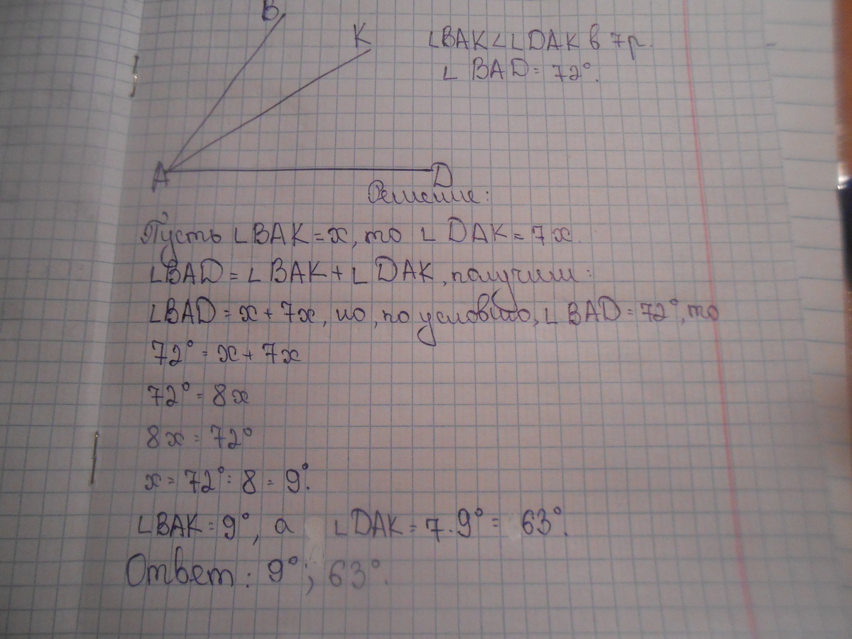 Луч АК принадлежит углу ВАD. Найдите углы ВАК и DAK если угол ВАК в 7 раз меньше угла DAK и угла BAD = 72 градуса