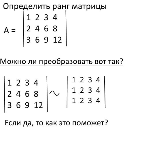 Действительно можно преобразовать к такому виду. Так как Из второй строки нужно вычесть первую. А из третьей первую, помноженную на 2. Получим, что надо. А так как все строки линейно зависимы, то ранг матрицы равен одному.