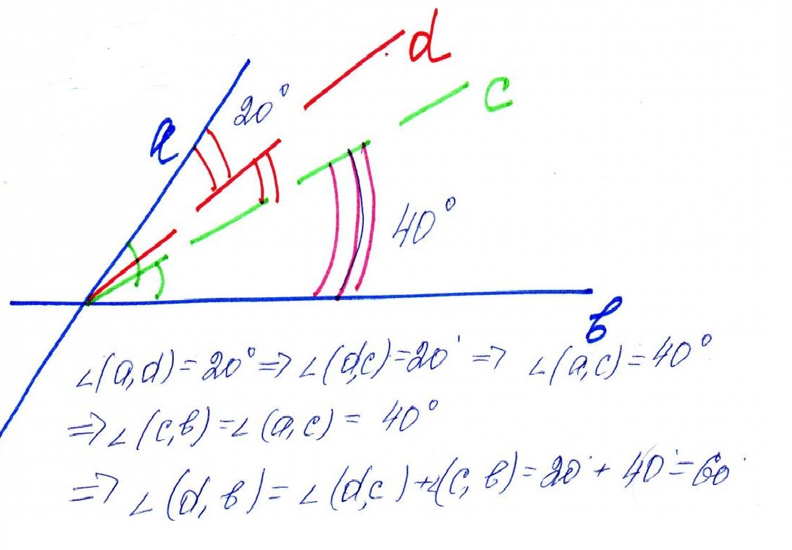 луч С- биссектриса угла (ab), луч d биссектриса угла (ac). Найти угол (bd), если угол (ad) = 20 градусов.