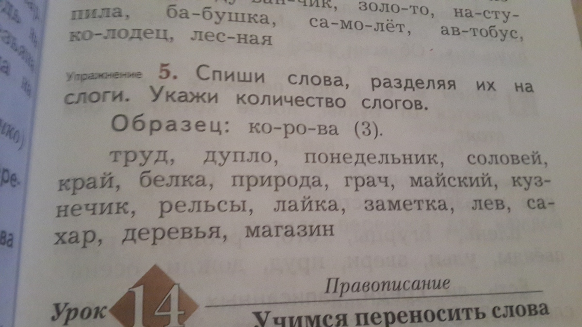 труд, дуп-ло, по-не-дель-ник, со-ло-вей, край, бел-ка, при-ро-да, грач, май-ский, куз-не-чик, рель-сы, лай-ка, за-мет-ка, лев, са-хар, де-ревь-я, ма-га-зин.