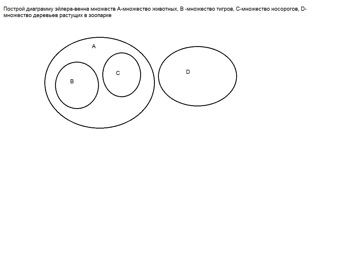 построй диаграмму эйлера-венна множеств А-множество животных, В -множество тигров, С-множество носорогов, D-множество деревьев растущих в зоопарке