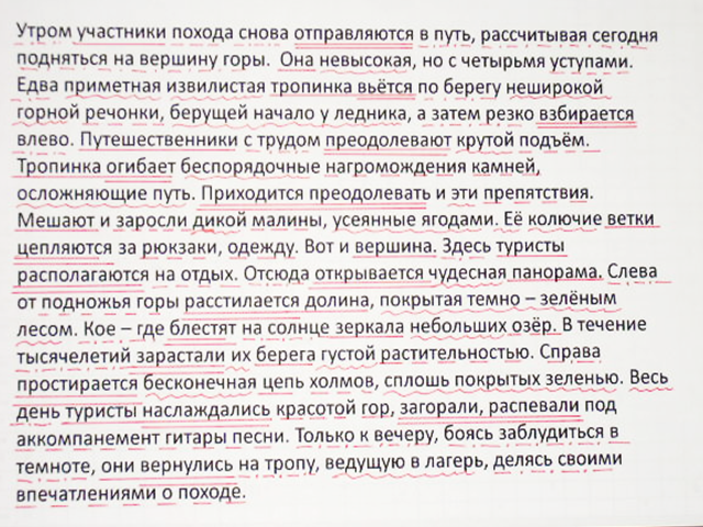 1) Разобрать предложение по членам подлежащее, сказуемое. Выделить графически причастные обороты и деепричастие оборотаУтром участники похода сноваотправляются в путь, рассчитывая сегодня подняться на вершину горы. * Она невысокая, но с четырьмя уступами. Едва приметная извилистая тропинка вьётся по берегу неширокой горной речонки, берущей начало у ледника, а затем резко взбирается влево. Путешественники с трудом преодолевают крутой подъём. Тропинка огибает беспорядочные нагромождения камней, осложняющие путь. ** Приходится преодолевать и эти препятствия. Мешают и заросли дикой малины, усеянные ягодами. Её колючие ветки цепляются за рюкзаки, одежду. Вот и вершина. Здесь туристы располагаются на отдых. Отсюда открывается чудесная панорама. Слева от подножья горы расстилается долина, покрытая темно – зелёным лесом. Кое – где блестят на солнце зеркала небольших озёр. В течение тысячелетий зарастали их берега густой растительностью. Справа простирается бесконечная цепь холмов, сплошь покрытых зеленью. Весь день туристы наслаждались красотой гор, загорали, распевали под аккомпанемент гитары песни. Только к вечеру, боясь заблудиться в темноте, они вернулись на тропу, ведущую в лагерь, делясь своими впечатлениями о походе..