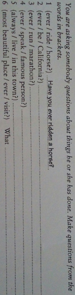 1 (ever / ride / horse?) ...Have you ever ridden a horse?