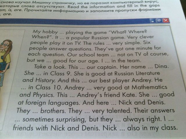 Роб снова изучал Мишину страничку,но её поразил компьютерный вирус,и некоторые слова отсутствуют.Прочитайте информацию и заполните пропуски формами am,is,are.