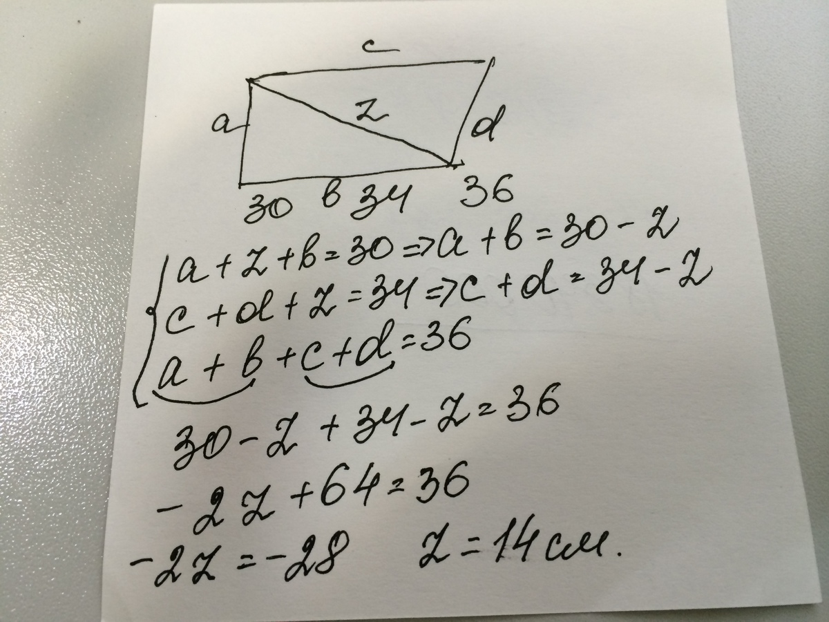 Четырёхугольник разделён диоганалью на два треугольника.Периметры этих треугольников и четырёхугольника соответственно равны 30м,34м,36.Найдите длину диагонали четырёхугольника