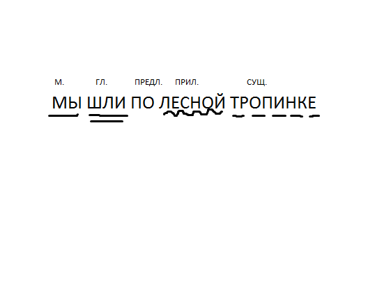 мы(местоим. 1 чертой) шли(сказуемое выражено глаголом 2черты) по(предлог) лесной(определение выражено прилагательным волнистая черта) тропинке( дополнение пунктирная черта)
