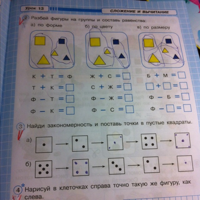 по форме к +т =ф, т+к=ф, ф-т=к, ф-к=т,,,,,, по цвету ж+с=ф, с+ж=ф, ф-ж=с, ф-с=ж,,,,,, по размеру б+м=ф, м+б=ф, ф-б=м, ф-м=б... к -это квадрат, т- это треугольник, ф- это фигуры..