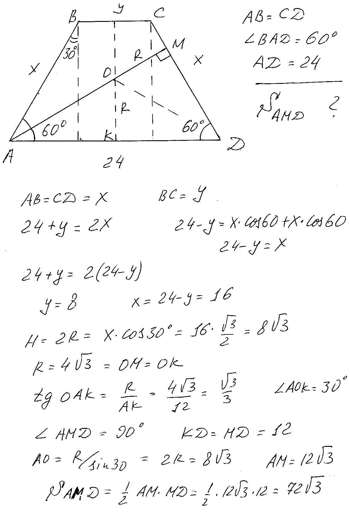 Обозначим трапецию АВСД. Стороны Х и У. Поскольку в трапецию можно вписать окружность-сумма боковых сторон =сумме оснований. Отсюда два уравнения из которых находим Х и У.Далее высоту Н=2R. Поскольку угол АОК=30 градусов а угол АДМ=60 градусов, то треугольник АМД-прямоугольный. О-центр вписанной окружности, но раз ОМ перпендикулярно СД, значит ОМ-радиус. Тогда из равенства треугольников ОКД и ОМД (по катету и гипотенузе) находим МД=12. Затем АМ и окончательный ответ S амд=72 корня из 3.