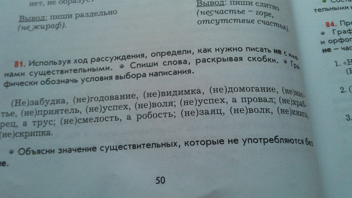 незабудка (без не неупотребляется), негодование ( без не неупотребляется) невидимка (без не не употребляется), недомогание (без не неупотребляется), ненастье (без не неупотребляется) , не приятель (=враг), не успех(= провал ), не воля (=заточение), не успех, а провал (противопостовление) ,не храблец, а трус (противопоставление), не смелость, а робость (противопоставление), не заяц , не волк, не книга, не скрипка.