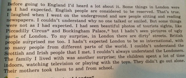 До того как отправиться в Англию я много о ней слышал. Некоторые вещи в Лондоне были именно такими какими я их представлял. Англичане сдержанные. Это правда. Я смеялся когда пошёл в метро и увидел людей сидящих и читающих газеты. Я не мог понять почему никто не разговаривает или улыбается. Но некоторые вещи были не такими какими я их себе представлял. Я увидел красивые фото достопримечательностей туристов, такие как Площадь Пикадилли* и Букингемский Дворец*, но я не увидел фотографии ужасных мест Лондона. К моему удивлению, в Лондоне грязные(1) улицы. Британцы меня также удивили. Я не думал что Лондон такой интернациональный, со многими людьми с разных концов света. Я не мог понять Шотландцев и Ирландский людей которых я встретил. Я не всегда мог понять Лондонцев. Семья, с которой я жил меня также удивили; дети проводили много времени дома, смотрели телевизор или играли с игрушками. Они не выходили одни на улицу. Их матери отводили их в школу и обратно.