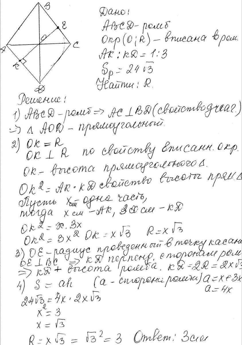в ромб вписана окружность. Точка касания делит сторону в отношении 1:3, площадь ромба равна 24√3 . Найдите радиус окружности