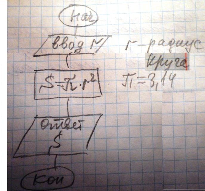 в задании используется простой линейный алгоритм: задаем R-радиус круга и по формуле вычисляем площадькруга