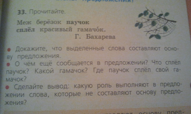 паучок- подлежащее, сплел- сказуемое. Сообщается о том, что паучок сплел гамачок. Паучок сплел гамачок. Красивый. Меж березок.