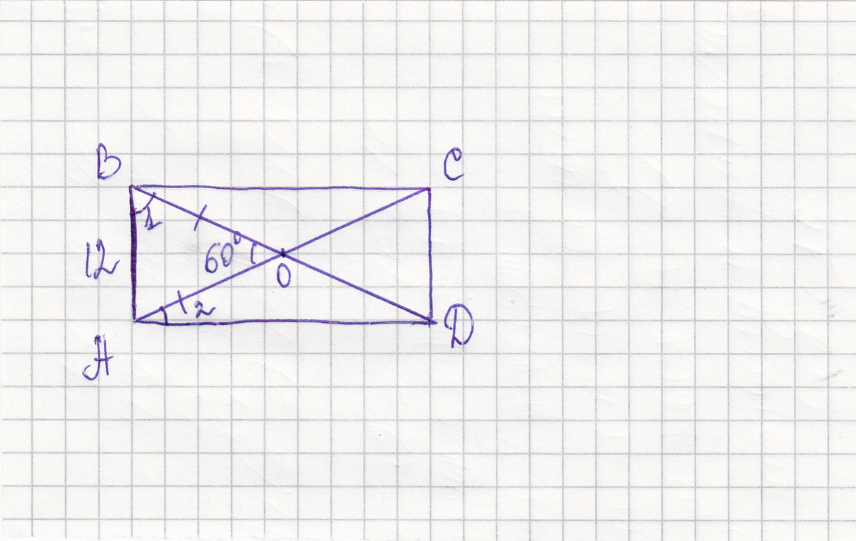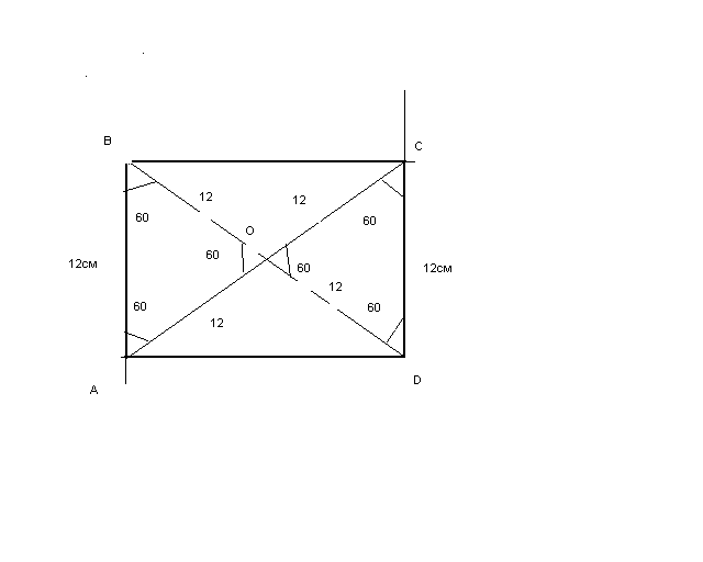 меньшая сторона прямоугольника равна 12 см .найти длины если они пересикаються под углом 60 градусов