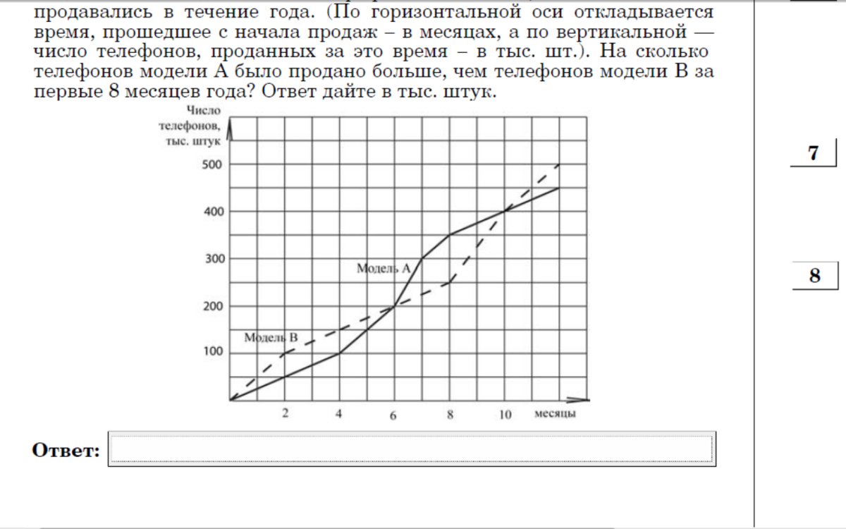 Фирма «Связь» выпустила в продажу две новые модели телефонов – модель А и модель В. На графиках показано, как эти модели продавались в течение года. (По горизонтальной оси откладывается время, прошедшее с начала продаж – в месяцах, а по вертикальной — число телефонов, проданных за это время – в тыс. шт.). На сколько телефонов модели А было продано больше, чем телефонов модели В за первые 8 месяцев года? Ответ дайте в тыс. штук.