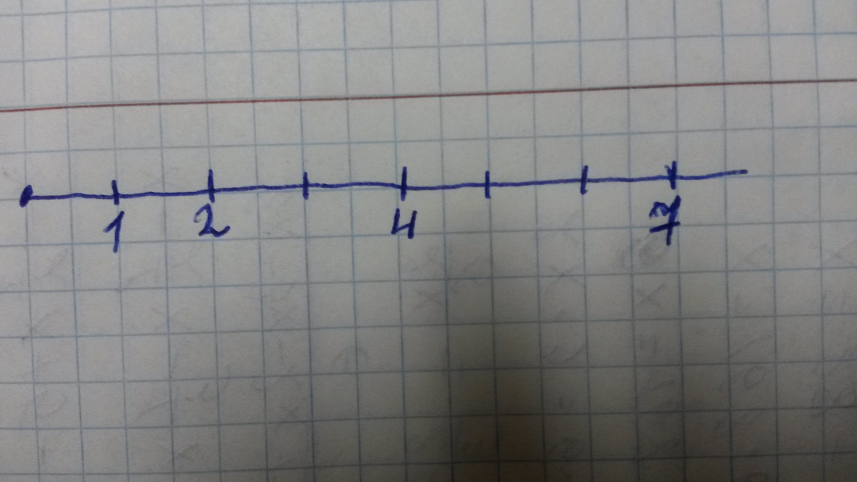 Начертите луч. Отступив от начала луча вправо на четыре клетки, отметьте на нем число 2. Отметьте на луче числа: 1, 4, 7.