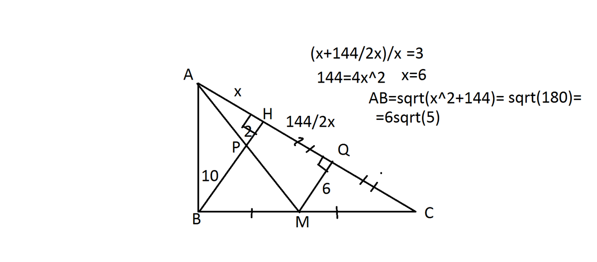 В прямоугольном треугольнике АВС с прямым углом В, проведены ВН – высота, АМ – медиана, которые пересекаются в точке Р. Определить длину АВ, если ВР=10, РН=2.