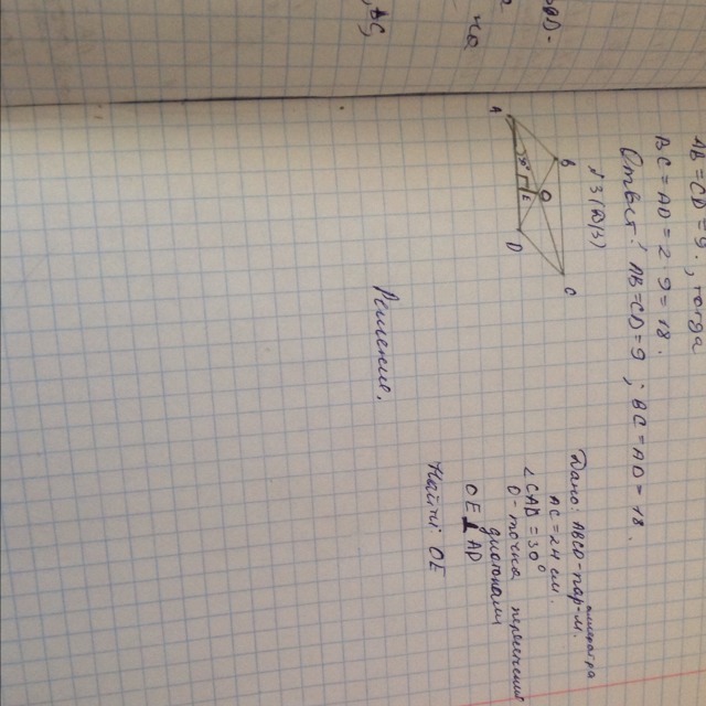 рассмотрим треугольник АОЕ , он прямоугольный так как ОЕ перпендикулярно АD
