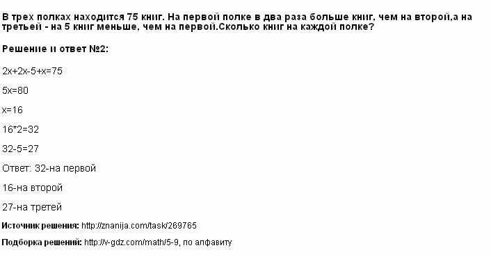 На трёх полках находиться 75 книг.На первой полке в два раза больше книг,чем на второй, а на третьей-на 5 книг меньше,чем на первой.Сколько книг на каждой полке?