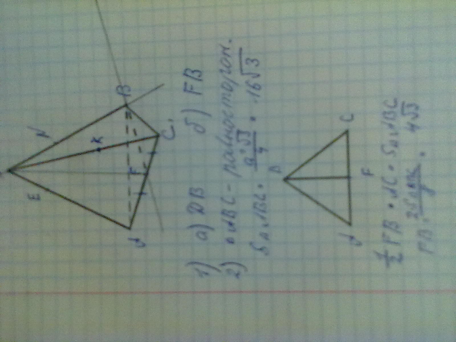 Дан тетраэдр ABCD, каждое ребро которого равно 8 см. K принадлежит DC, E принадлежит AD, F принадлежит AC, N принадлежит DB, AF=FC. 1) назовите прямую по которой пересекаются а) ADB и DBC; б) ACB и DFB. 2) Найдите длину FB и площадь треугольника ABC