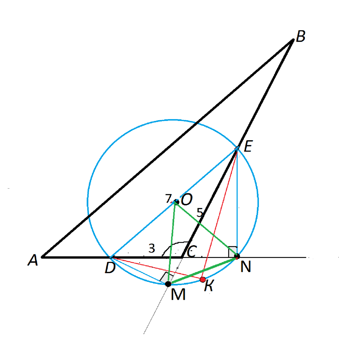 Так как окружность пересекает продолжения сторон АС и ВС, а точки N и М лежат на ней, углы DNЕ и DМЕ, опирающиеся на диаметр DE, - прямые, а угол DСЕ , вершина С которого находится внутри окружности, тупой.
