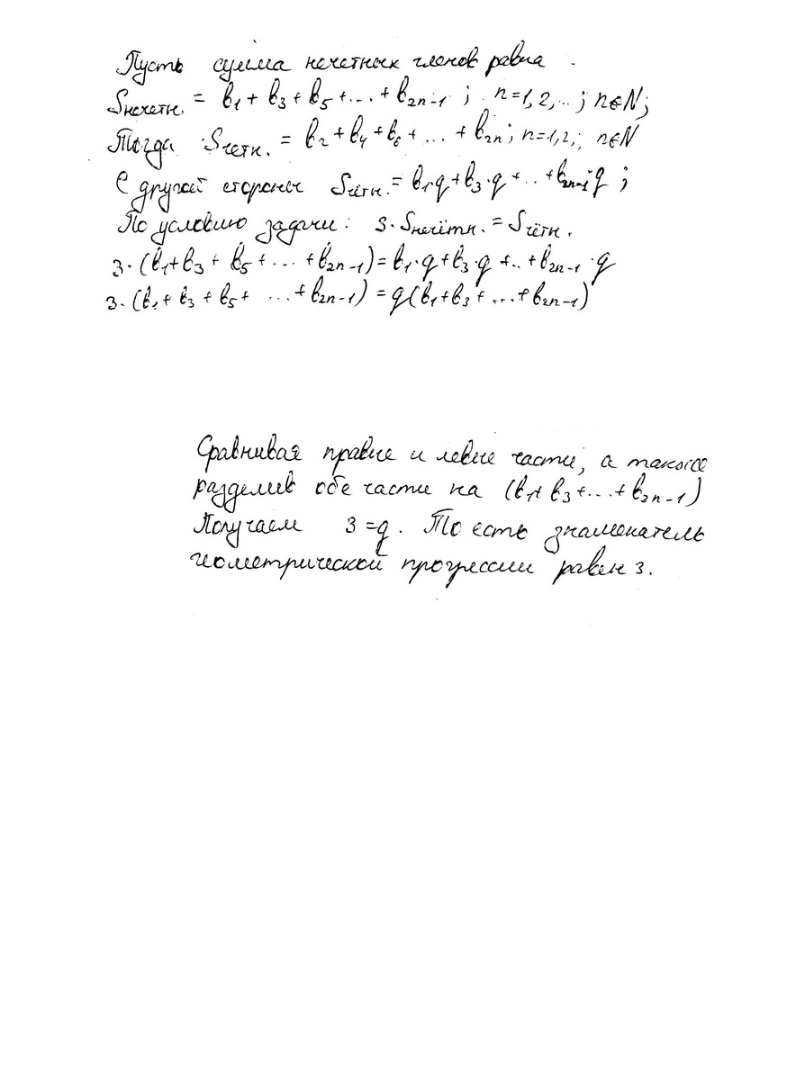 В геометрической прогрессии с четным числом членов сумма всех её членов в 3 раза больше суммы членов, стоящих на нечетных местах. Найти знаменатель прогрессии.