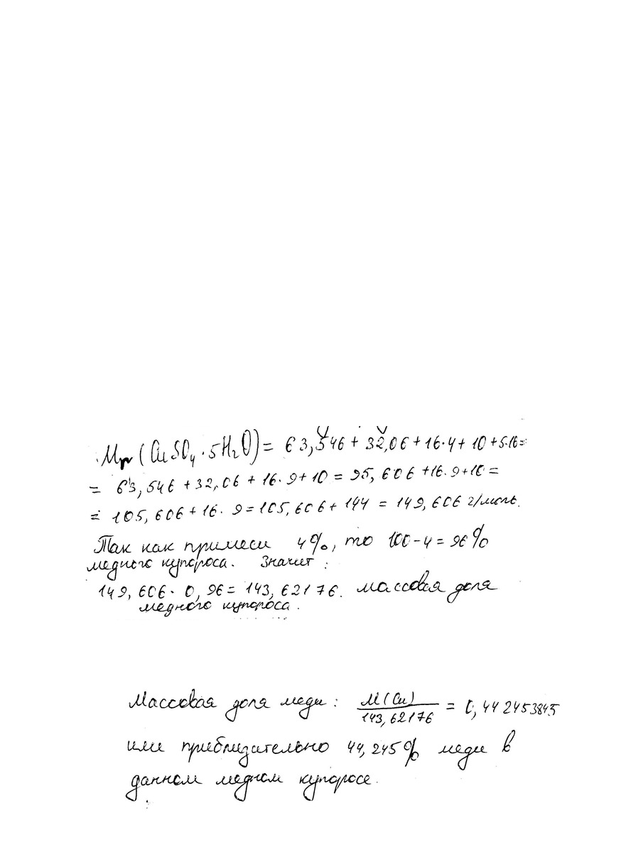 Вычислите массовую долю Купрума в медном купоросе CuSo4 * 5H2O, если массовая доля примеси в соединении составляет 4%.
