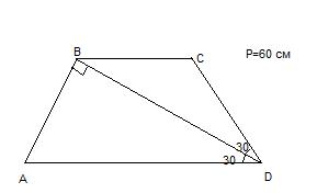 1. В трапеции ABCD диагональ BD перпендикулярна боковой стороне AB , угол ADB = углу BDC = 30 градусов. Найдите длину AD, если периметр трапеции = 60см.