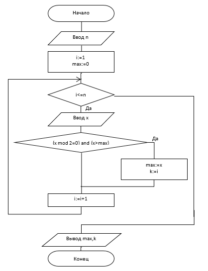 Задание: в последовательности целых чисел определить максимальное четное число и его порядковый номер.