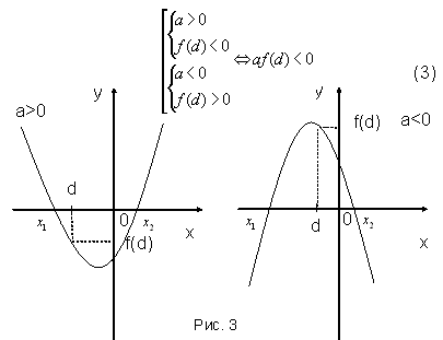 Для того, чтобы число d было расположено между корнями квадратного трёхчлена, необходимо и достаточно выполнение условий на рисунке (см. вложение). Так как у нас коэффициент при x^2 положителен и равен 1, то достаточно выполнение условия f(x) < 0. Решаем: