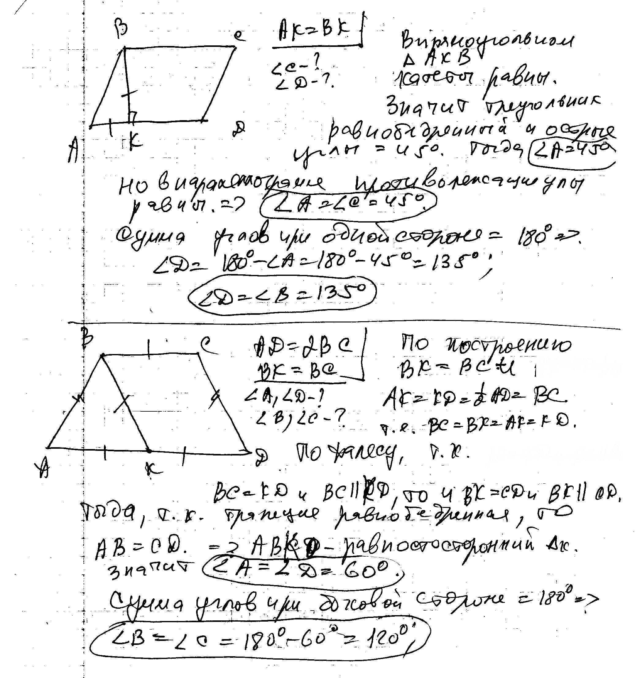 Дан параллелограмм ABCD с острым углом A. Из вершины B опущен перпендикуляр BK к прямой AD, AK=BK. Найдите углы C и D. В равнобедренной трапеции большее основание в два раза превосходит меньшее. Середина большего основания удалена от вершины тупого угла на расстояние, равное длине меньшего основания. Найдите углы трапеции.