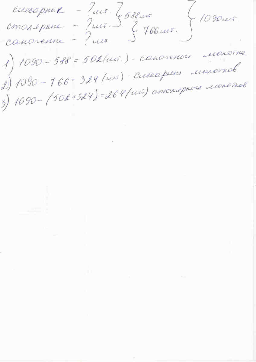 Здравствуйте. Помогите пожалуйста написать условия и решения этой задачи. Кузнецы - инструментальщики изготовили 1090 молотков: слесарных, столярных исапожных. Слесарных и столярных молотков было 588, столярных и сапожных-766. Сколько изготовлено слесарных молотков? Ск. столярных? А сколько сапожных?