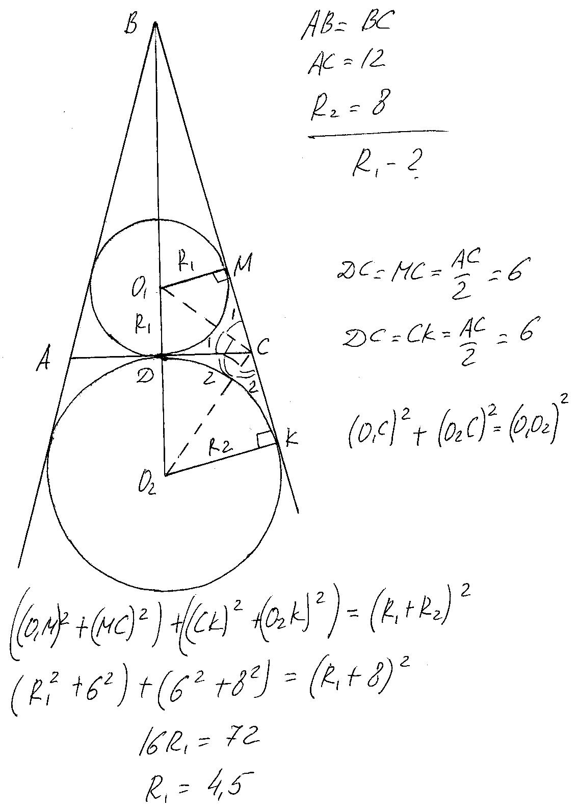 Обозначим треугольник АВС(смотри рисунок). Проведём радиусы О1М и О2К к боковой стороне. Треугольники О1МС и О1ДС равны по катету равному R1 и гобщей гипотенузе О1С. Аналогично равны треугольники О2ДС и О2СК. Отсюда МС=6 и СК=6. Также будут равны О1СМ=О1СД=угол1 и О2СД и О2СК=угол 2. Но угол1+угол1+угол2+угол2=180 или 2(угол1+угол2)=180. Отсюда угол1+угол2=90. А это есть угол О1СО2. То есть треугольник О1СО2-прямоугольный. По теореме Пифагора находим R1=4,5. Кстати для заданных условий угол О1СО2 всегда будет равен 90 градусов при любых R1 и R2.