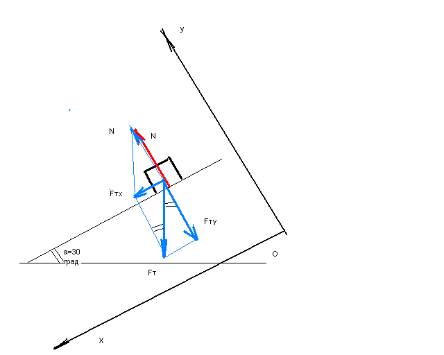 Помогите умоляю!!! На тело, лежащее на наклонной плоскости, действует сила тяжести и сила реакции опоры со стороны наклонной плоскости. Определите модуль равнодействующей этих сил и ее направление, если масса тела 500г, а угол наклонной плоскости с горизонтом равен 30 градусов