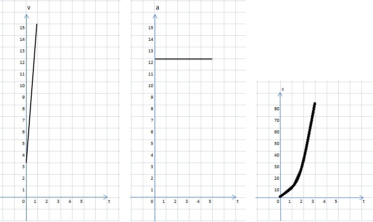 скорость материальной точки описывается уравнением Vx=12t+3 Найти координату в момент времени т=2с. в начальный момент времени точка имела координату х0=1 построить графики зависимостей x(t) Vx(t) a(t)