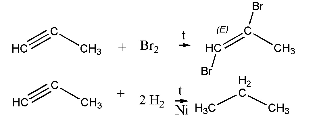 Напишите уравнения реакций присоединения , в которых 1 моль пропина присоединяет : 1 моль брома; 2 моль водорода. Назовите продукты реакции.