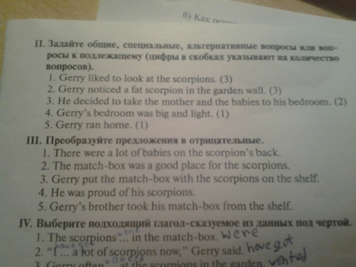 Did Gerry like look at the scorpions? 2)Who did like look at the scorpions? 3)Did Gerre like look at the scorpions or butterfly? 1)Did Gerry notic a fat scorpion in the garden wall? 2) Where did Gerry notic a fat scorpion? 3)Who did notic a fat scorpion in the garden wall? 1)Did he decid to take the mother and the babies to his bedroom? 2)Where did he decid to take the mother and the babies? 1)what was Gerry bedroom& 1)Where did Gerry run? Вот всё первое задание.