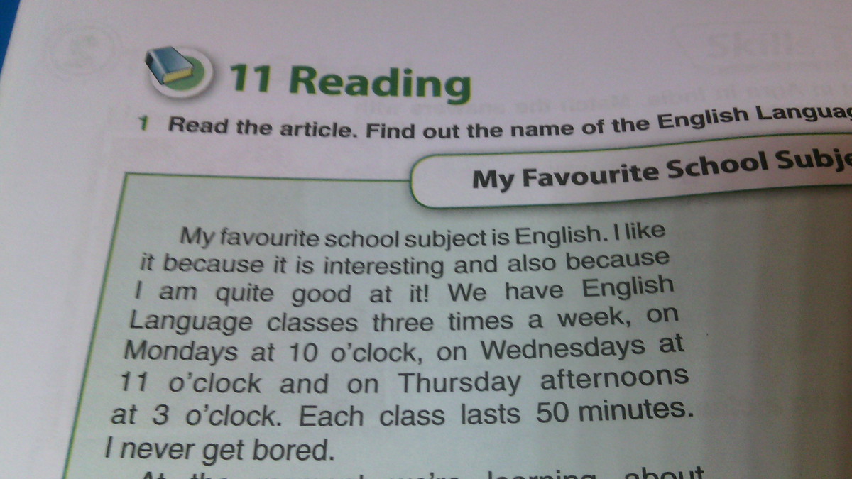 Мой любимы школьный предмет Английский. Мне он нравится потому что он интересный и потому что я в нём довольно хорош! У нас уроки Английского Языка три раза в неделю, в Понедельник в 10:00 часов, Среду в 11:00 часов и в Четверг во второй половине дня, в 3:00(15:00) часа. Каждый урок длится 50 минут. Я никогда не скучаю.